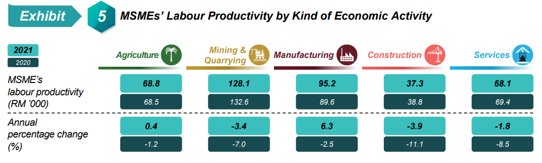 MSMEs’ labour productivity by economic activity showed that Agriculture and Manufacturing were the sectors which recorded increase in productivity during 2021 with the growth of 0.4 per cent and 6.3 per cent, respectively. Meanwhile, MSMEs’ labour productivity in Mining & quarrying (-3.4%), Construction (-3.9%) and Services (-1.8%) sectors remained in a downward trend with a slower rate compared to the previous year (Exhibit 5).