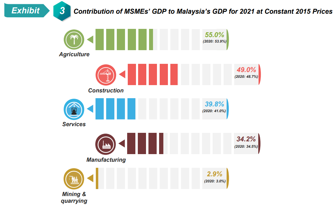 In terms of MSMEs’ GDP contribution by kind of economic activity, the Services, Manufacturing and Mining & quarrying sectors recorded a decline in 2021. However, this performance was partially offset by the expansion in the share of the Agriculture and Construction sectors. MSMEs’ GDP was led by the Agriculture sector with a share of 55.0 per cent (2020: 53.9%), attributed to Rubber, oil palm, livestock and other agriculture sub-sector as portrayed in Exhibit 3. The MSMEs’ GDP share for the Construction sector rose to 49.0 per cent as compared to 48.7 per cent in 2020.