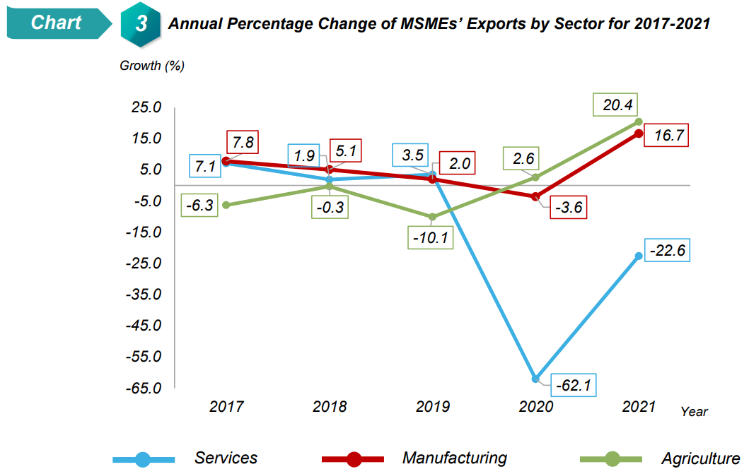Likewise, the value added of MSMEs in Agriculture sector expanded to 1.9 per cent from negative 0.7 per cent in the preceding year. The performance was supported by the Rubber, oil palm, livestock and other agriculture sub-sector which flourished to 2.5 per cent in 2021 (2020: 1.0%). On the other hand, the Fishing sub-sector continued to record negative growth this year.