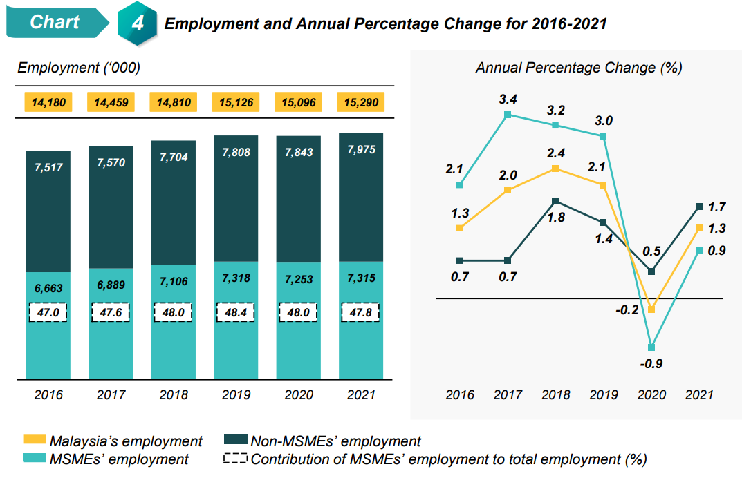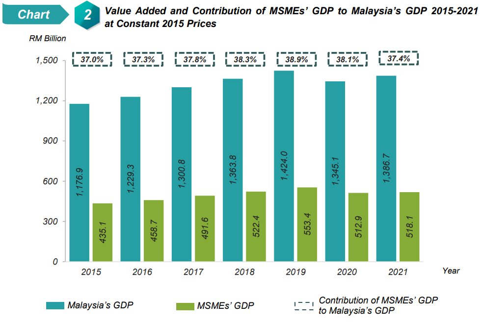 Malaysia’s economy regained its momentum in 2021, where the country has transitioned to Phase 4 of the National Recovery Plan (NRP) and inter-state travel restrictions were lifted. The gradual recovery will enable entrepreneurs to pick up business momentum, thus fueling Malaysia's economic recovery. Nevertheless, Malaysia’s economic performance in 2021 is still lower than pre-pandemic levels in 2019. Subsequently, the share of Micro, Small & Medium Enterprises (MSMEs) in terms of Gross Domestic Product (GDP), Exports, and Employment remained to decline in 2021.