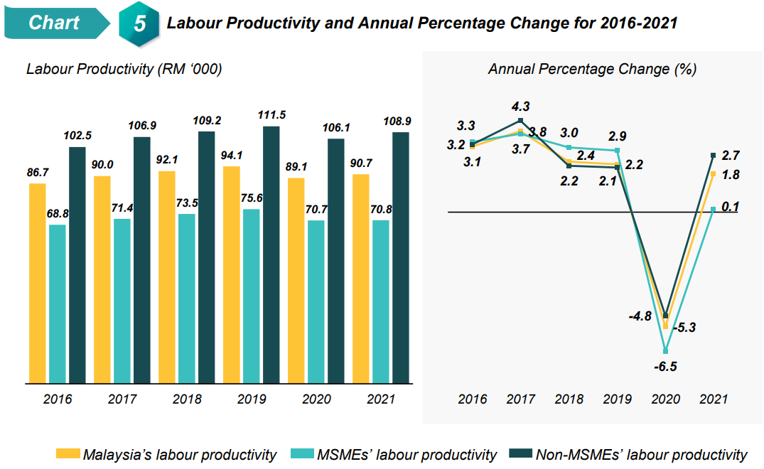 Malaysia’s economy and labour market regained momentum in 2021. MSMEs’ labour productivity as measured by value added per employment grew marginally by 0.1 per cent as compared to negative 6.5 per cent in 2020 to record a productivity value of RM70,827 per person (2020: RM70,723 per person) as shown in Chart 5. The MSMEs’ productivity value was still lower compared to 2019, hence indicating that it has yet to return to the pre-pandemic level.