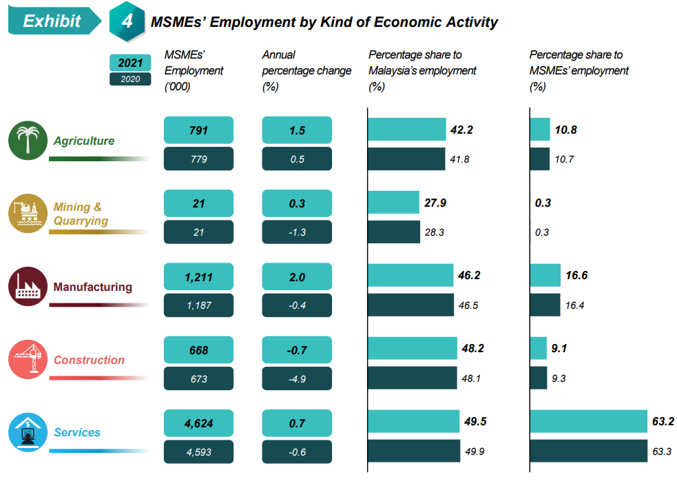 The number of MSMEs’ employment for the Services sector accounted for 4.62 million persons, contributing 49.5 per cent of overall employment in this sector. In terms of annual change, MSMEs’ employment in Services sector grew marginally by 0.7 per cent as compared to negative 0.6 per cent in 2020. The increase was largely contributed by two sub-sectors namely Wholesale & retail trade, food & beverage and accommodation (1.2%) and Other services (2.0%).