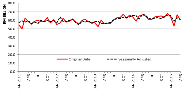 On a m-o-m basis seasonally adjusted terms, exports declined RM2.1 billion (-3.4%) to RM60.8 billion.