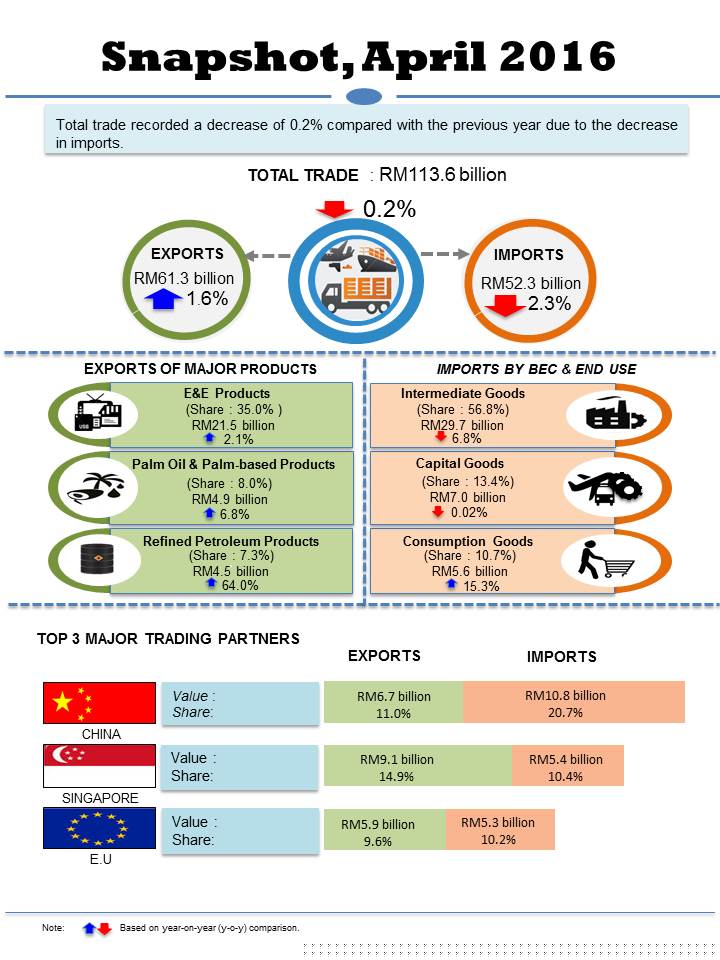 Total trade in April 2016 which was valued at RM113.6 billion decreased RM258.8 million or 0.2% from the year before. It also posted a drop of 6.8% or RM8.3 billion, month-on-month. On a y-o-y basis, the trade surplus increased 31.9% or RM2.2 billion to RM9.1 billion. However, on a m-o-m basis it declined 19.1% from RM11.2 billion.
