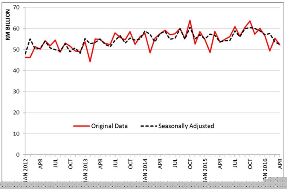 - On a m-o-m basis, imports was lower by RM3.1 billion (-5.6%) from RM55.4 billion. In seasonally adjusted terms, imports also decreased 2.4%.