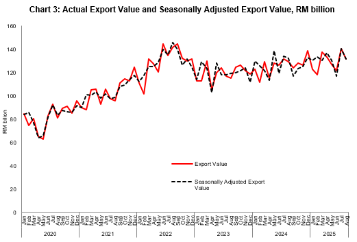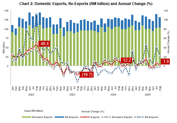 Malaysia’s exports rose by 1.9 per cent in August 2025, rising from RM129.1 billion in August 2024 to RM131.6 billion.
