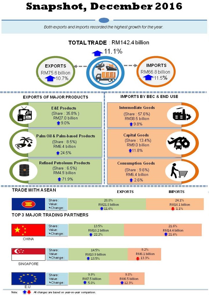 - On a year-on-year (y-o-y) basis, exports expanded RM7.3 billion (+10.7%) to RM75.6 billion. Re-exports in December 2016 was valued at RM11.4 billion and accounted for 15.1% of total exports.