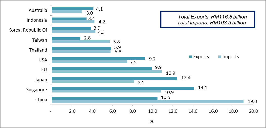 - On a y-o-y basis, the contraction in exports was attributed to lower exports to People’s Republic of China (-RM1.6 billion), Indonesia (-RM645.5 million), Japan (-RM463.1 million), Taiwan (-RM444.2 million) and Republic of Korea (-RM414.7 million).