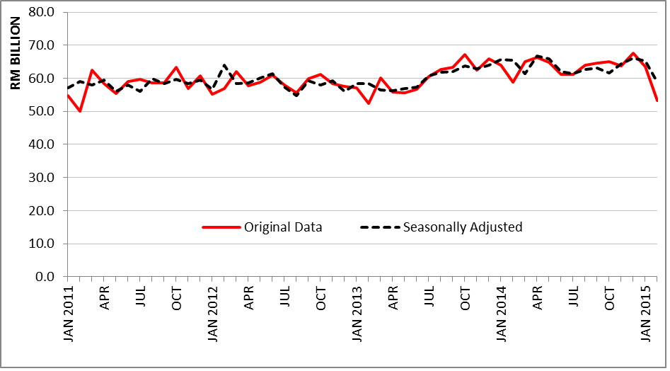 On a m-o-m basis seasonally adjusted terms, exports dropped RM6.3 billion (-9.6%) to RM58.9 billion.