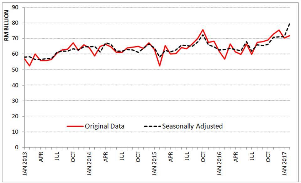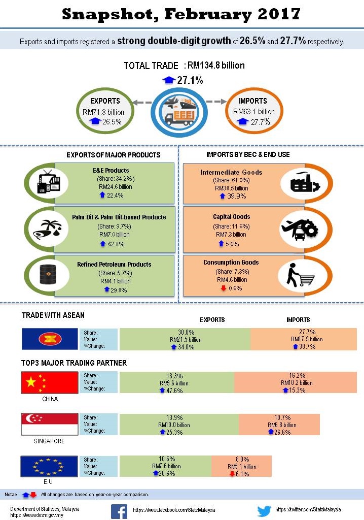 - On a year-on-year (y-o-y) basis, exports continued its strong growth momentum expanded by RM15.1 billion (+26.5%) to RM71.8 billion. Re-exports in February 2017 was valued at RM11.0 billion and accounted for 15.3% of total exports.