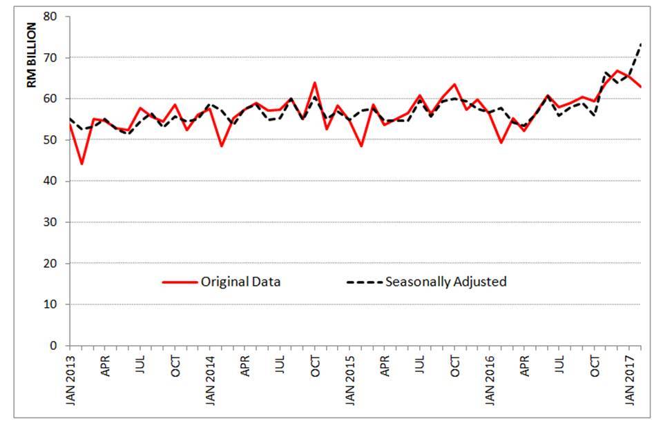 - On a m-o-m basis, imports declined RM2.5 billion (-3.8%) from RM65.5 billion. In seasonally adjusted terms, imports expanded 11.4%.