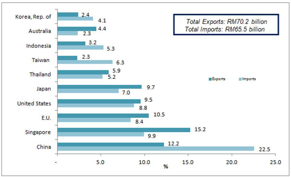 - On a y-o-y basis, exports increased due to the rise in exports to China (+RM2.1 billion), Singapore (+RM1.7 billion), Japan (+RM1.3 billion), Australia (+RM946.3 million) and European Union (+RM794.4 million).