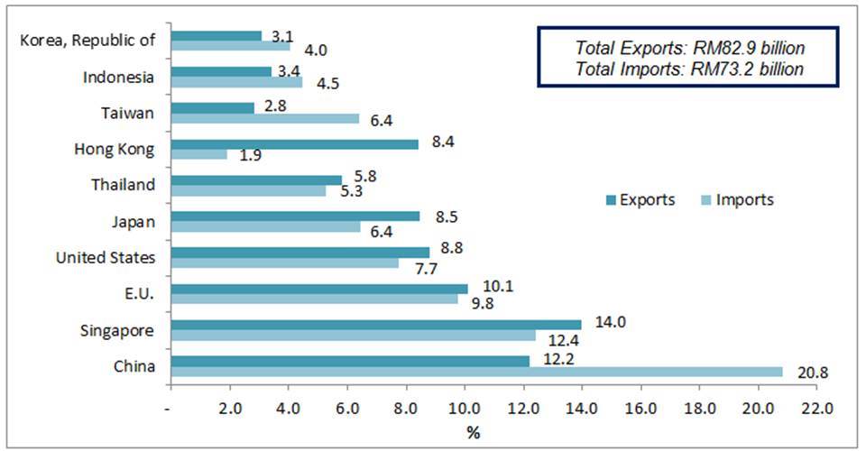 - On a y-o-y basis, imports was also in a similar trend increasing by RM7.6 billion (+11.6%) to RM73.2 billion.