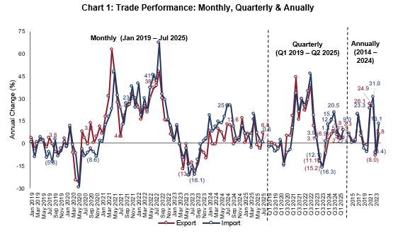 Exports, imports and total trade for January to July 2025 rose by 4.3 per cent, 5.1 per cent and 4.7 per cent, respectively, as compared to the same period of preceding year. Meanwhile, trade surplus declined by 4.7 per cent.