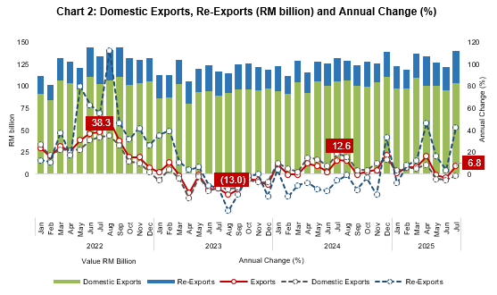 This growth was in line with a 42.0 per cent increase in re-exports, which expanded to RM37.0 billion from RM26.1 billion, accounting for 26.4 per cent of total exports. However, domestic exports, which contributed 73.6 per cent of total exports, declined by 1.9 per cent to RM103.4 billion.