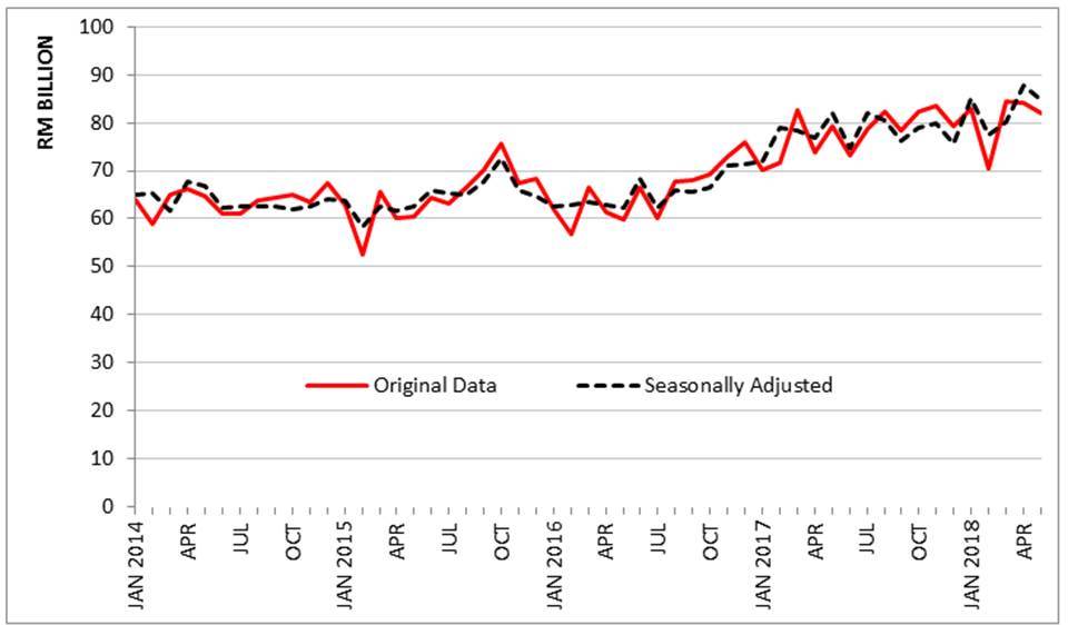 On a m-o-m basis, imports rose RM2.8 billion or 3.9% from RM71.2 billion. The increase in imports was contributed by intermediate goods, capital goods and consumption goods.