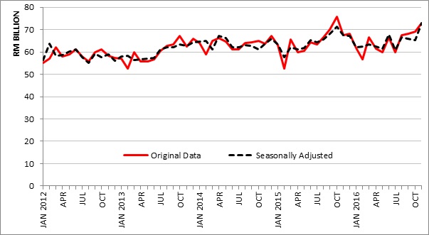 Total trade in November 2016, which was valued at RM136.6 billion, expanded RM11.7 billion (+9.3%) from a year ago. It posted an increase of RM8.0 billion or 6.2% from the previous month. A trade surplus of RM9.0 billion was recorded in November 2016, a decrease of 11.3% from RM10.2 billion registered a year ago. It also posted a decrease of RM726.0 million or 7.4% when compared with the previous month.
