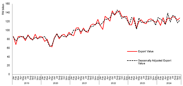 Exports inched up by 1.6 per cent or RM2.0 billion in October 2024 to RM128.1 billion, while imports posted an increase of 2.6 per cent or RM3.0 billion to RM116.1 billion as compared to RM113.2 billion in the previous year. In addition, the trade balance continuously posted a surplus with RM12.0 billion, fell 7.6 per cent as compared to RM13.0 billion in October 2023.