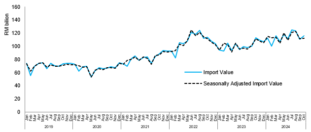 On a y-o-y basis, imports by End Use registered a positive growth for both intermediate and consumption goods. Imports of intermediate goods rose RM6.8 billion (+12.3%), while consumption goods edged up 3.0 per cent or RM276.4 million. On the other hand, capital goods shrank 2.7 per cent or RM344.2 million in October 2024.