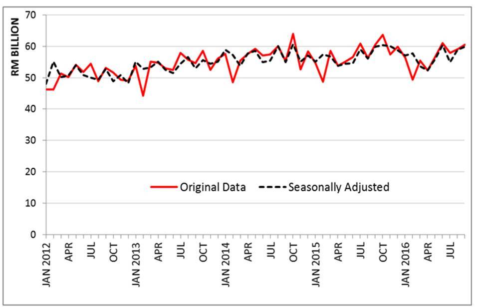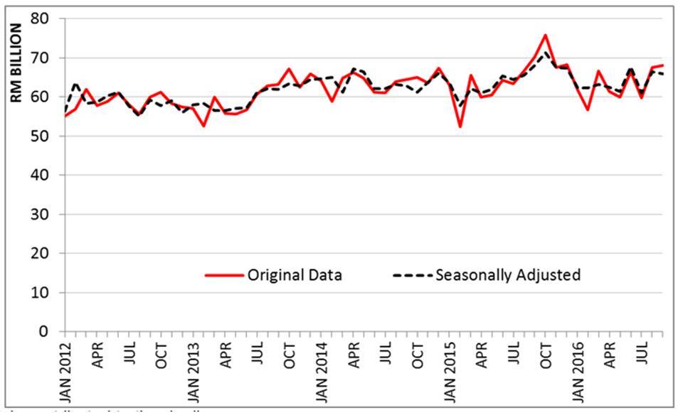 - On a m-o-m basis, imports also grew RM1.4 billion (+2.4%) from RM59.1 billion. In seasonally adjusted terms, imports rose 1.6%.