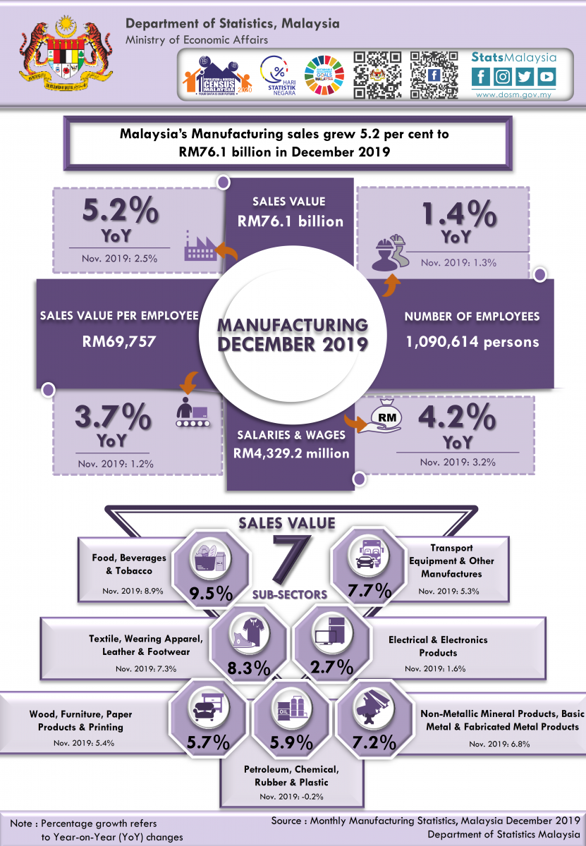 Malaysia’s Manufacturing sales grew by 5.2 per cent to RM76.1 billion in December 2019