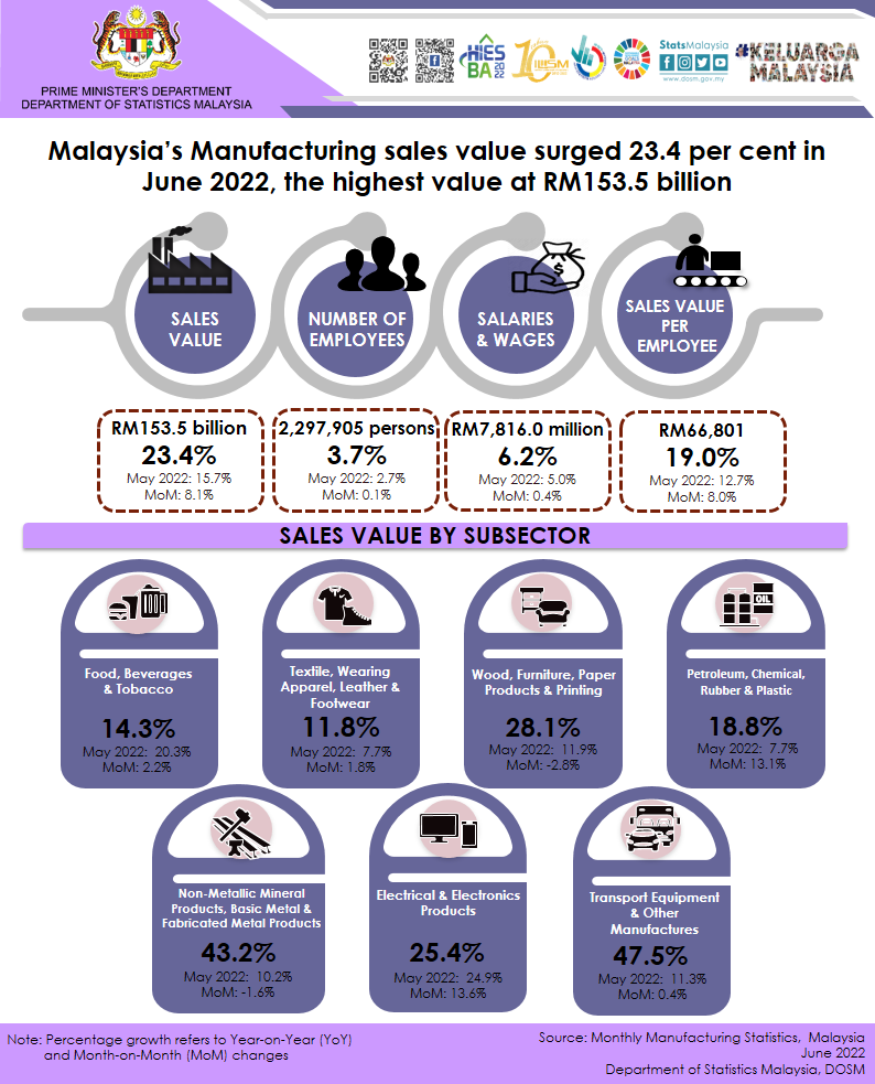 The full publication of the Monthly Manufacturing Statistics, June 2022 can be downloaded through eStatistik portal.