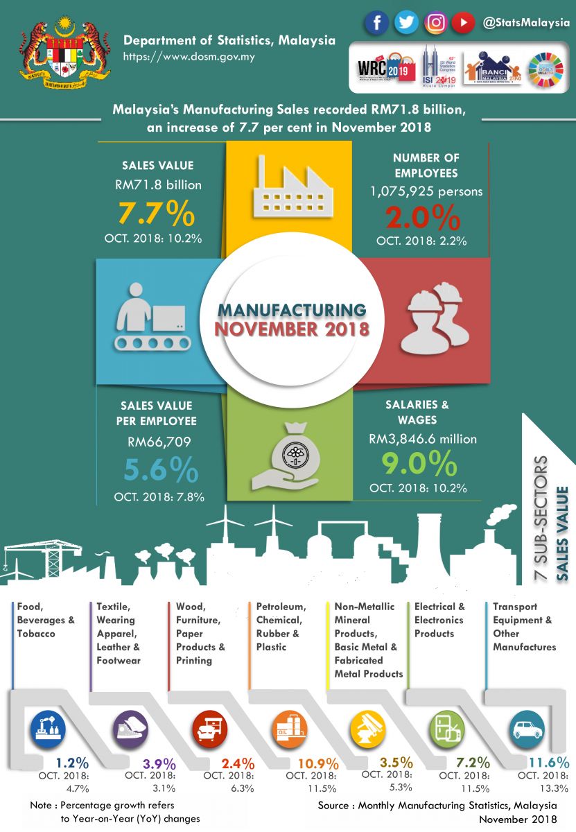 Malaysia’s November 2018 Manufacturing sales recorded a growth of 7.7 per cent, rising to RM71.8 billion as compared to RM66.6 billion reported a year ago.