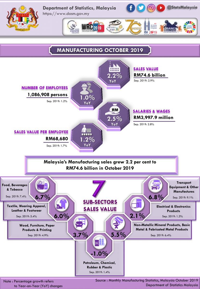 Malaysia’s Manufacturing sales grew by 2.2 per cent to RM74.6 billion in October 2019