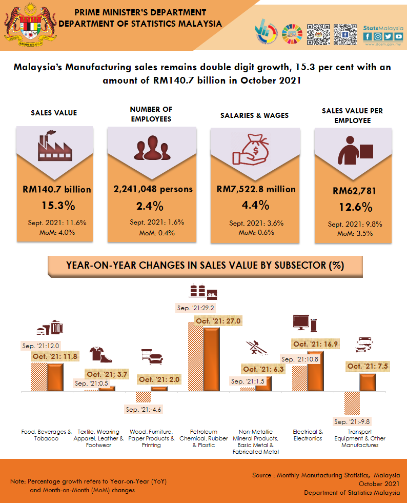 Malaysia’s Manufacturing sales remains double digit growth, 15.3 per cent with an amount of RM140.7 billion in October 2021