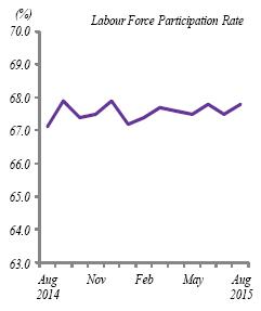 Labour force participation rate was 67.8% Labour force participation rate for August 2015 increased by 0.3 percentage points to 67.8 per cent as compared to the previous month. This rise was due to the increase of employed persons in the labour market by 0.7 per cent to 13.9 million persons. Year-on-year comparison showed that the labour force participation rate increased by 0.7 percentage points compared to 67.1 per cent in August 2014.