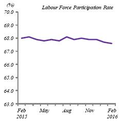 Labour force participation rate was 67.6% The labour force participation rate in February 2016 decreased 0.1 percentage points to 67.6 per cent compared to the previous month. Year-on-year comparison showed that the labour force participation rate decreased 0.4 percentage points compared to 68.0 per cent in February 2015.