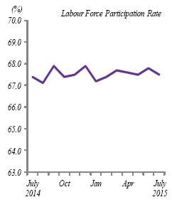 Labour force participation rate was 67.5% Labour force participation rate for July 2015 declined by 0.3 percentage points to 67.5 per cent as compared to the previous month. This declined was due to the increase of unemployed person by 10 thousand persons in the same period. Year-on-year comparison showed that the labour force participation rate was increased by 0.1 percentage points as compared to 67.4 per cent in July 2014.
