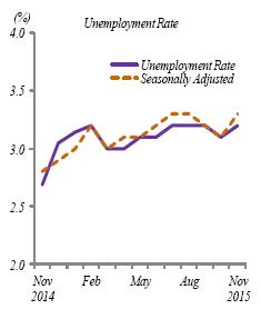 Unemployment rate increased to 3.2% The unemployment rate increased by 0.1 percentage points to 3.2 per cent in November 2015 compared to the previous month. Year-on-year comparison showed that the unemployment rate rose by 0.5 percentage points. The seasonally adjusted unemployment rate was 3.3 percent, up 0.2 percentage points compared to the previous month.