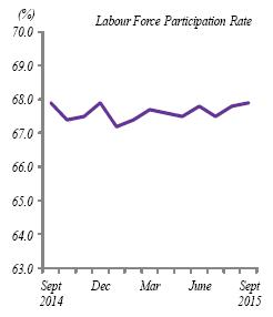 Labour force participation rate was 67.9% Labour force participation rate for September 2015 increased by 0.1 percentage points to 67.9 per cent as compared to the previous month. Year-on-year comparison showed no changes in the labour force participation rate in the current month as recorded in September 2014.