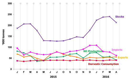 Chart 1: Monthly production, exports, imports, domestic consumption and stocks of natural rubber 2015/2016