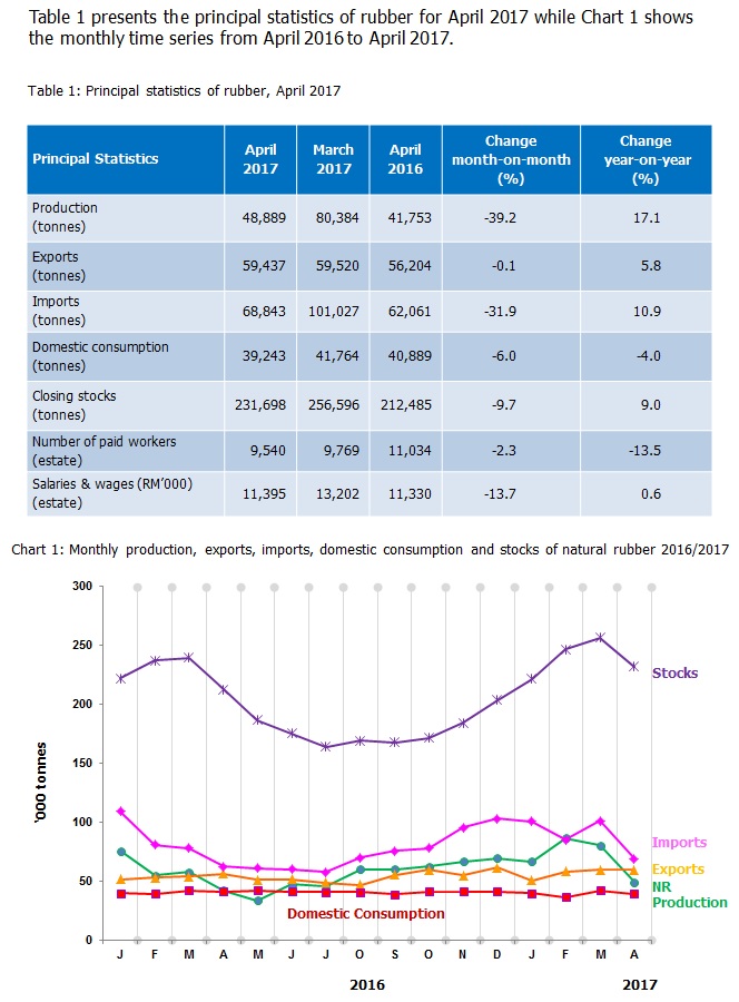 At the end of April 2017, level of NR stocks declined by 9.7 per cent to 231,698 tonnes.