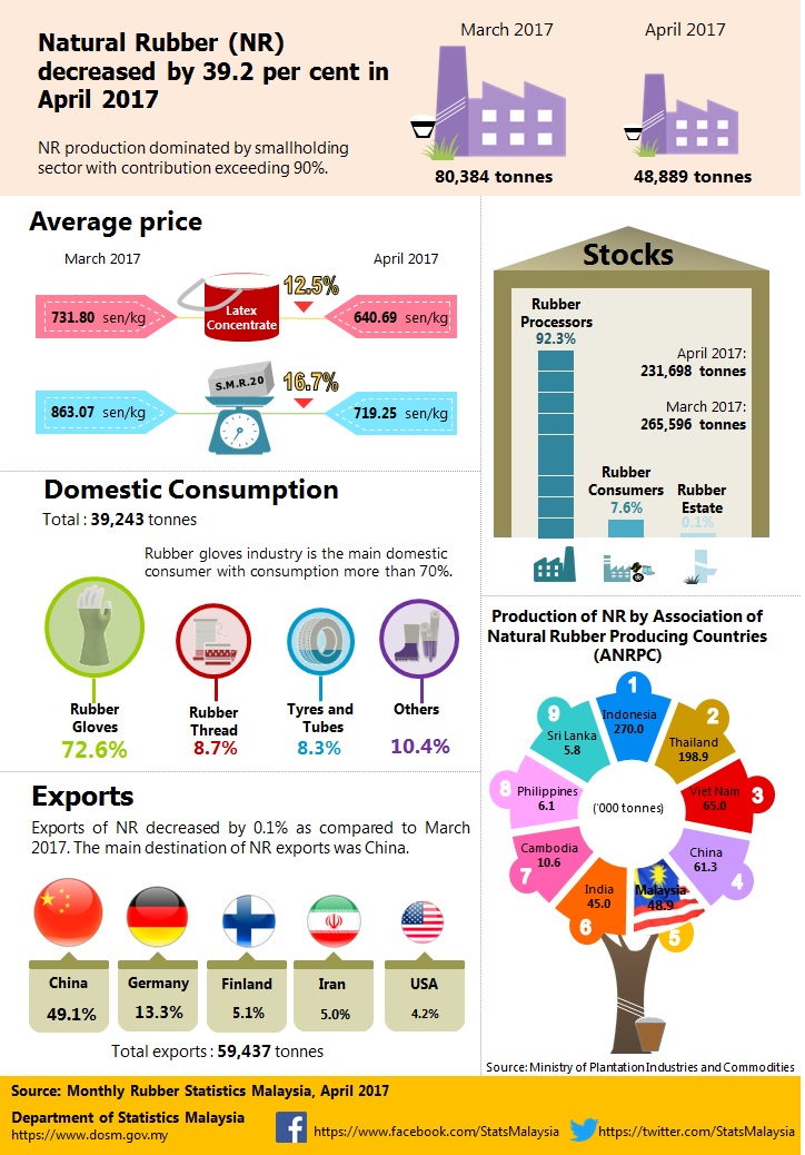 Production of NR in April 2017 decreased by 39.2 per cent to 48,889 tonnes as compared to the previous month. The main contributor of NR production is from smallholding sector with a contribution exceeding 90 per cent.