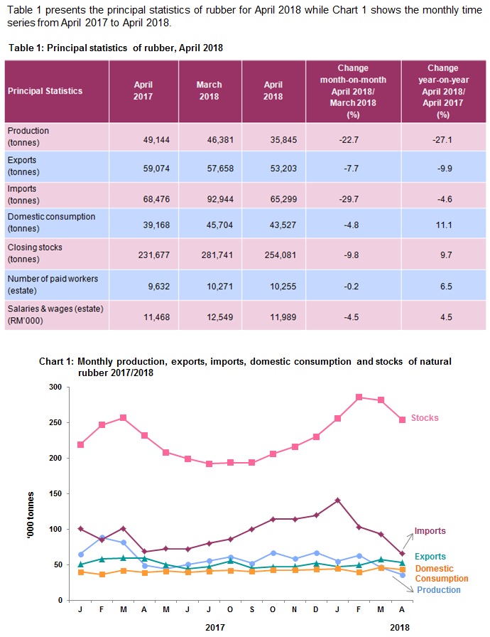 Natural rubber production in April 2018 was 35,845 tonnes, dropped by 22.7 per cent as compared to 46,381 tonnes in March 2018. For year-on-year, the production also showed a decrease of 27.1 per cent.