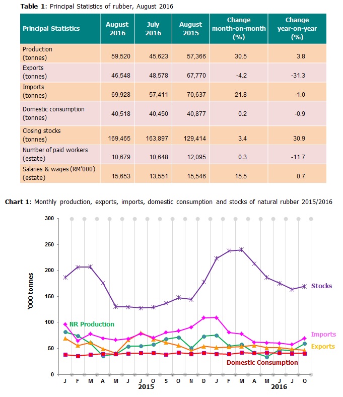Table 1 presents the principal statistics of rubber for August 2016 while Chart 1 shows the monthly time series.