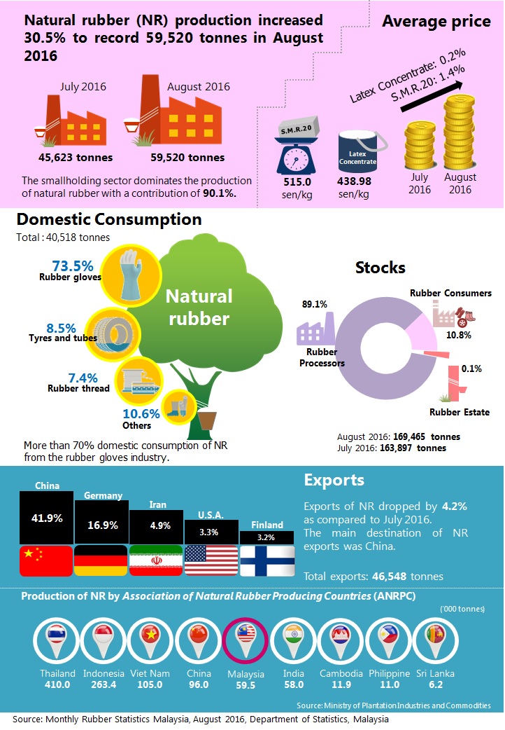 Meanwhile, domestic consumption of natural rubber went up by 0.2 per cent to 40,518 tonnes in August 2016. The rubber gloves industry remain as main domestic consumption 73.5 per cent.