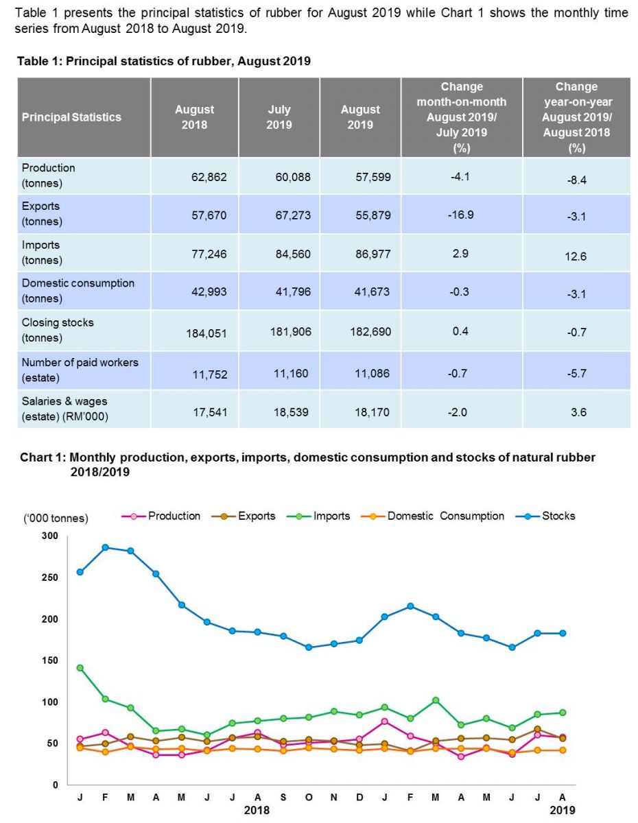 Stocks of natural rubber was recorded 182,690 tonnes in August 2019 as compared to 181,906 tonnes in July 2019, with an increase of 0.4 per cent.