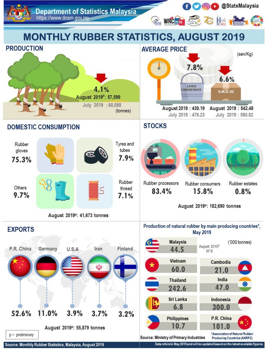 Malaysia's natural rubber production in August 2019 decreased 4.1 per cent as compared to last month, from 60,088 tonnes to 57,599 tonnes. For year on year comparison, the production decreased 8.4 per cent as compared to August 2018.