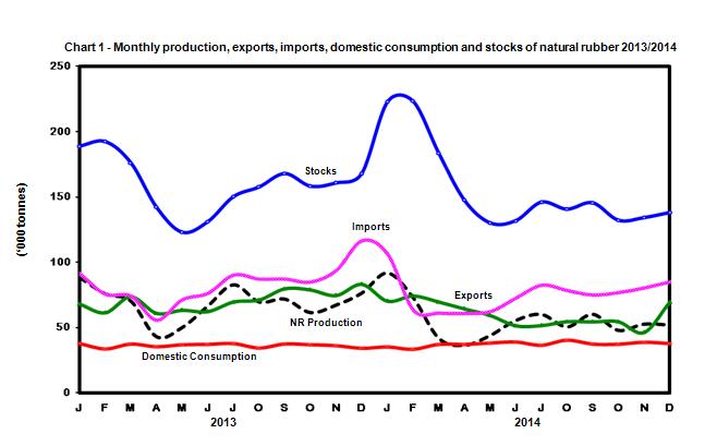 A total of 137,990 tonnes of NR stocks was recorded in December 2014, rose by 3,868 tonnes (+2.9%) compared to the previous month. Nevertheless, the level of NR stocks shows a decrease of 29,942 tonnes (-17.8%) when compared to the level of stocks in December 2013.