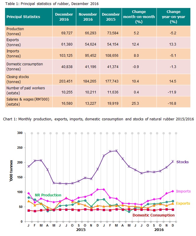 Natural rubber (NR) production increased by 5.2 per cent in December 2016 to 69,727 tonnes as compared to November 2016. The main contributor of NR production is from smallholding sector with 92.9 per cent.