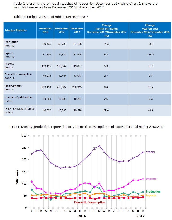Meanwhile in terms of stocks, the level of NR stocks increased by 6.4 per cent to 230,315 tonnes at the end of December 2017.