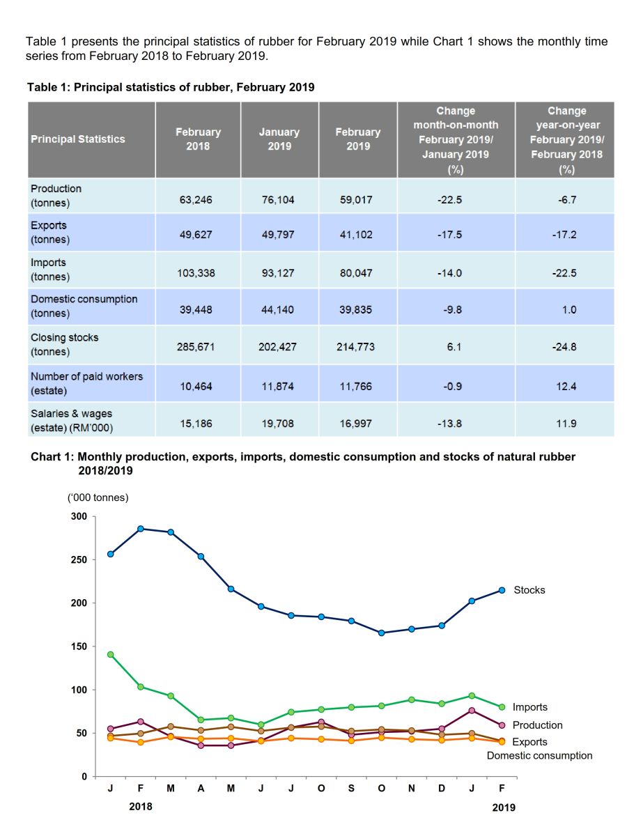 Malaysia’s natural rubber production in February 2019 was 59,017 tonnes, a decrease of 6.7 per cent as compared to February 2018. Month-on-month comparison showed the production of natural rubber declined by 22.5 per cent from 76,104 tonnes in January 2019.