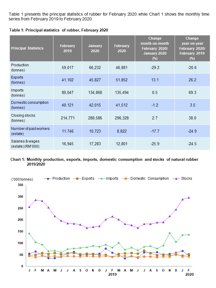 However, the census showed that Malaysia's natural rubber production decreased 29.2 per cent in February 2020 to 46,881 tonnes as compared to 66,232 tonnes in the previous month. Comparison year on year also showed a decrease of 20.6 per cent as compared to the same month in the previous year. This declining trend is due to the annual wintering period that typically falls between February and May. This is a normal cycle of rubber trees where the leaves of the tree wither and fall. This scenario significantly affected both the principal metabolism and latex production.