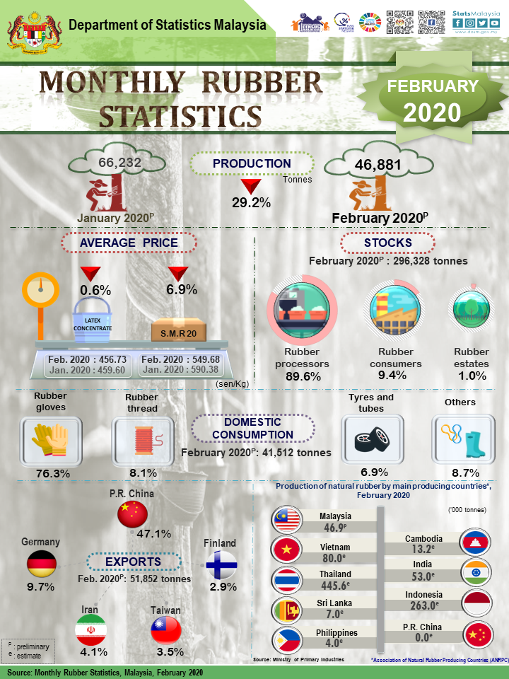 The Monthly Rubber Census for reference February 2020 was conducted in March 2020, prior to the announcement of the Movement Control Order (MCO). Activities of collecting statistics in the industry especially on production was not affected after the MCO's announcement during that period.