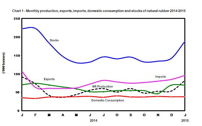 The level of stocks of NR in January 2015 which registered at 187,720 tonnes was 45,840 tonnes (+32.3%) higher than December 2014 but compared to a year ago, the level of stocks dropped by 35,391 tonnes (-15.9%).