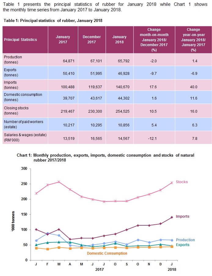 Meanwhile, in terms of stocks, the level of natural rubber stocks increased by 10.5 per cent to 254,525 tonnes at the end of January 2018.